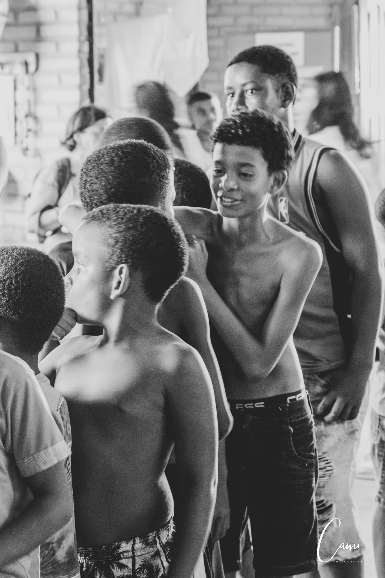 The children line up, sign in, play in the playground, voice the drum, until they are called to receive their costume: White shorts and face painted black.
